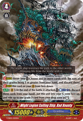 AUTO, VC: When it attacks, [COST SB3 Grade 3s] and retire all of your and your opponent’s rearguards, and if you have 15 or more cards in the drop zone, call 5 cards from your drop zone to RC, and all of your units get power plus 10k until the end of turn.