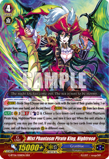 - Mist Phantasm Pirate King, Nightrose: This card is honestly just an alternative battle phase attacker. The same board building engine can be used for this stride as well but this card offers 2 calls as opposed to 1 without discarding a card from your hand. CB is one of the easiest resources to really manipulate so the CB2 isn’t really an issue. This card is another Bad Bounty Lite while being safer yet weaker than Negrosonger as the units it calls doesn’t gain any additional power. Think of it as having the Nightrose G3 as a stride but you don’t get the power boost and your call cost is 1 CB higher.