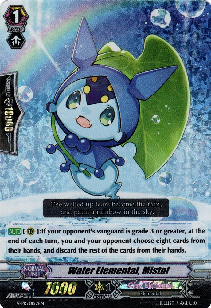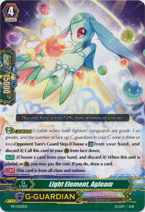 Light Element, Agleam: This card is interchangeable with Ractome but its main purpose is being your first G-guardian if you are striding second AND as a means to fix your hand while stopping an attack with a 15k shield. In premium you may think its a waste to discard a 20k V-Heal Trigger for a 15k G-guardian that has a discard 1 and draw 1 skill but, for the most part, in premium due to there still being a saturation of old G-Era units still being used in the main deck; there are still plenty of cases where a 15k shield can stop most attacks in your opponent’s first stride OR at the start of their battle phase. Usually just the first couple attacks at most. This card provides the opportunity to basically accelarate your GB count while fixing your hand potentially. This is important leading up to your first stride as a each face-up card in your G-zone is 2 calls from drop while also being a target for Rain Element Tear as a means to CC (counter-charge) early if need be whether this be from your opponent damage denying or you using up your CB early on.