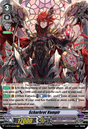 - Vampire Princess of Starlight, Nightrose/Seabed Demon Beast, Scaredick: These 2 cards are more options for a G3 rearguard that can enhance your offensive capabilities. Scaredick synergizes well with Nightmist since it is a 2 critical beater and you can dump your hand to increase dropzone count, getting 30 cards in drop is not that difficult with enough conscious effort but you dont naturally get there with game progression. Starlight is a great extender for your G1 vanillas and Zarzan. Having Starlight in the backrow rearguard means you can call Zarzan at any point of your battle phase when you revive a unit. This availability is nice but keep in mind that the Zarzan “loop” is somewhat fragile and riding into Starlight as your first G3 is objectively worse than Scaredick and Undead Dragon since at least with them you get a Protect Gift. If you want to run either, ensure to take into account the negative possibilities and know how to adapt.