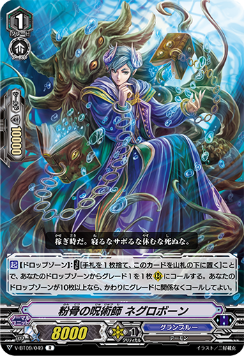 - Diabolist of Corpse, Negrosonger: This card is a nice alternative option to an end game but its downside is that you can only call 1 unit off its skill and you have to discard a card. This means the unit you call cannot be an attack extending unit unless you allocated a CB for it in advance and has to draw you card or be a reliable enough attack to force a valuable guard. This card’s targets are really limited to Undead Dragon, draw cards like Ghost Ship, or honestly vanilla units since they scale super well with Cycloned. This card can close out games though since its “board problem” is solved thanks to Negrobone and if Bad Bounty is our main end game, a card that generates no board and nothing except an additional vanguard attack, the Negrosonger stands to really benefit off the same cards as well. Think of this card as Bad Bounty Lite.