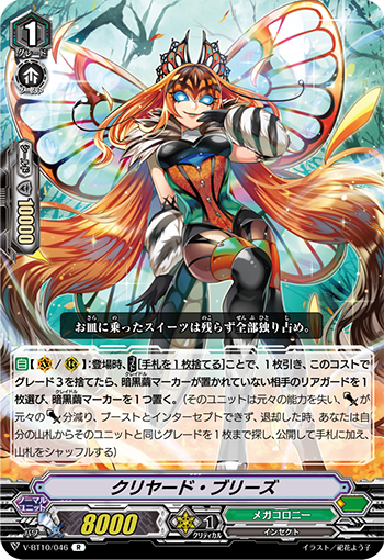 [discard a card from your hand], draw a card, and if you discarded a grade 3 for this cost, choose one of your opponent’s rear-guards without any Cradle marker, and put a Cradle marker on it.