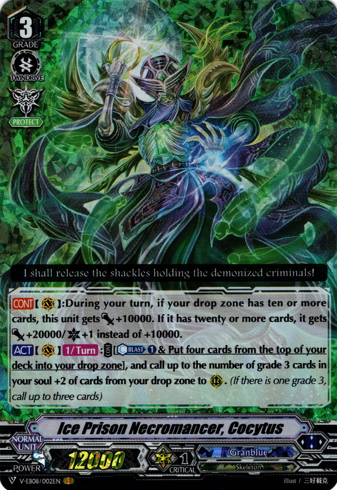 - Ice Prison Necromancer, Cocytus/King of Demonic Seas, Basskirk: These 2 cards essentially are a backup vanguard and is more of a budget option now rather than a main ride. Out of the 2 Basskirk is better for this deck build since dropzone count is really a 2nd hand objective for this deck and being able to use a card in soul is helpful in some cases. Cocytus is beneficial as well since you can technically mill 2 good units and use it off that but its up to you if you want to run these 2 units as neither will break 22k power on first G3 ride and the only difference is control. Do you want to incorporate some RNG milling so that you can attempt to call a good board or do you want to be safer and use a card from your soul with a guaranteed power increase. Bad Bounty synergizes better with Cocytus as it is a 32k base with 2 criticals as opposed to Basskirk’s 17k with 2 criticals but this is only assuming you have zero accesses to Nightrose V. If you can only get 1 Nightrose V series and are more of a budget player then you can honestly just grab Basskirks as a intermediary card until you get more copies of Nightrose.