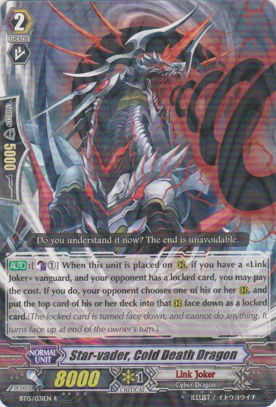 [put this unit into your soul], choose up to one of your opponent’s locked cards, and unlock it. If you unlocked a card, choose one of your opponent’s rear-guards other than the unlocked unit, and lock it.