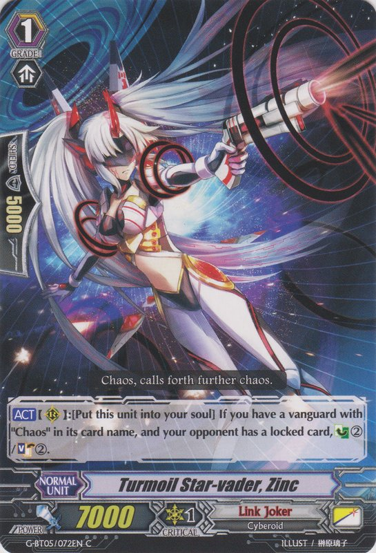 Zinc is a really good card since it can CC2 and SC2 for the cost of itself. This kind of resource control will probably not be replicated but be aware of this card’s presence. Soul is never an issue with the card and this card can enable a Chaos player at 2 damage.