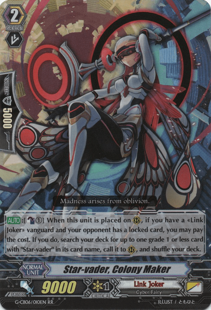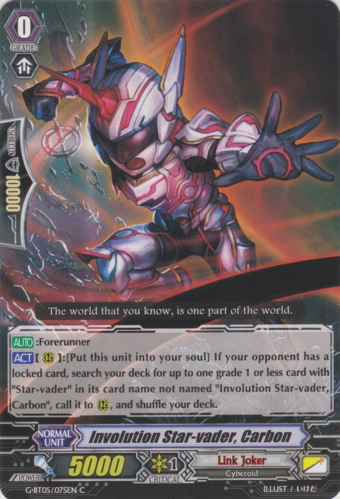 [AUTO](VC/RC):When its attack or the attack it boosted hits a vanguard, look at five cards from the top of your deck, reveal up to one card with “Star-vader” in its card name from among them and put it into your hand, and shuffle your deck.