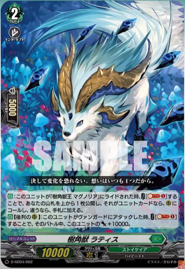 [AUTO]:When this unit is rode upon by “Sylvan Horned Beast King, Magnolia”, [COST][Soul-Blast 1], reveal the top card of your deck, if it is a unit card, call it to (RC), and if it isn’t, put it into your hand. [AUTO](Back Row RC):When this unit attacks a vanguard, [COST][Soul-Blast 1], and this unit gets [Power]+10000 until end of that battle.