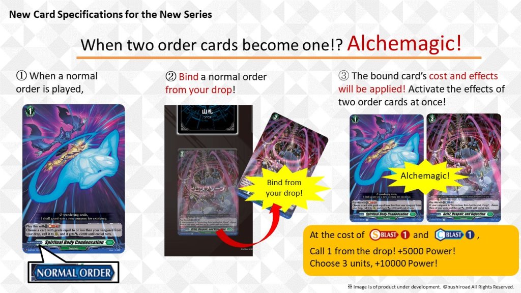 Skills: [CONT](VC):When you would play a normal order, you can bind a normal order with a different card name from your drop, and Alchemagic. (Combine the costs, and add the effect to the back!)