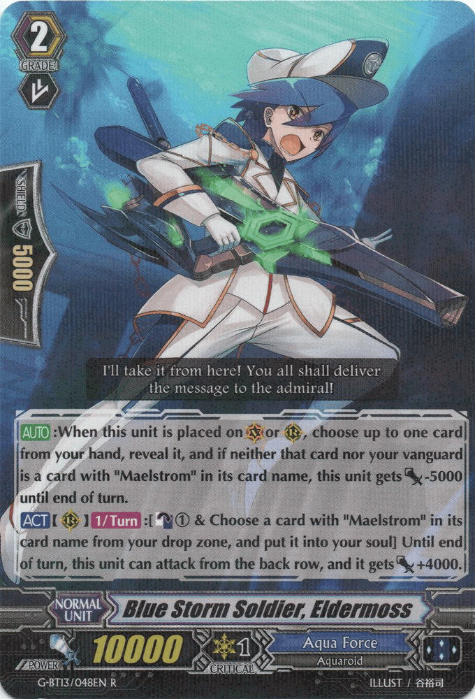 Obviously, these arenβt the only back row attackers Aqua Force has, I just think theyβre good examples. Eldermossβ effect is an example of a back row attacker doing something else useful. With the 10k base being helpful defensively in that era of Vanguard G, and the back row attacking being an ancillary benefit to the recycling of Maelstrom cards from your drop zone, while Medla, meanwhile, is a back row attacker and thatβs it.