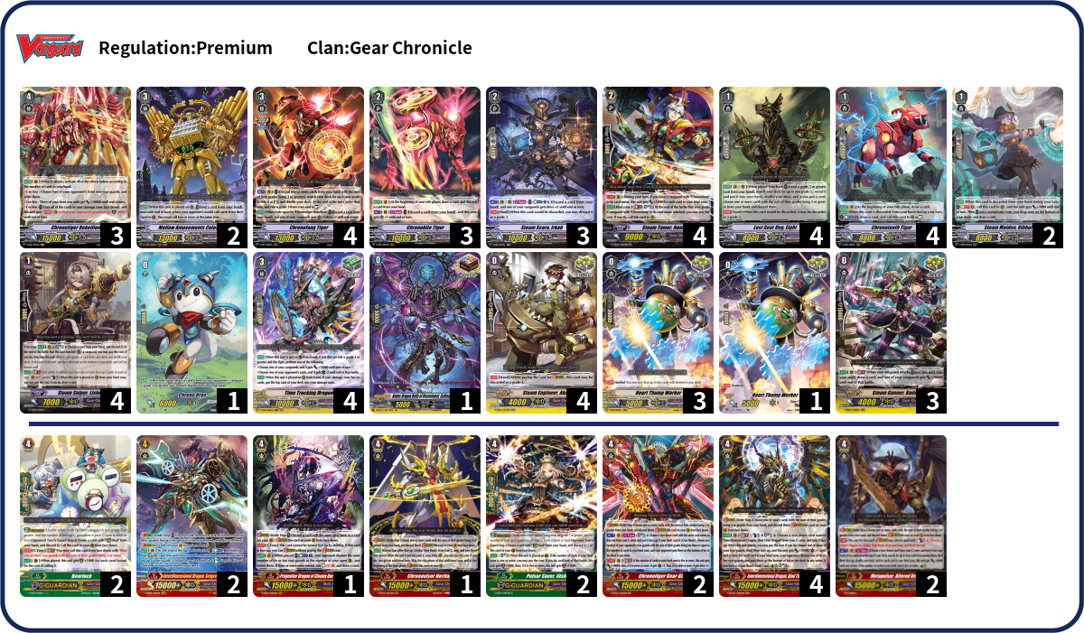 Cody: The Winning Image of the deck is to focus on having a full board with Steam Sniper Lishma boosting The Grogrock Dragon stride with the Chronofang Tiger as a Heart card with no cards in hand, re-riding as Chronotiger Rebellion and using Lishma’s time leap cost and Chronofang Tiger’s rode upon the cost to reset the hand to 1 card and activate all the effects of Rebellion. Combine this with using the guard restriction provided by Mellow Amusements Colossus (Which you would use to bind a Steam Tamer Nanni from hand with) to punish trying to use a perfect guard against this setup means trying to avoid the Rebellion’s 3 damage swing (if on Force 2) a difficult situation.