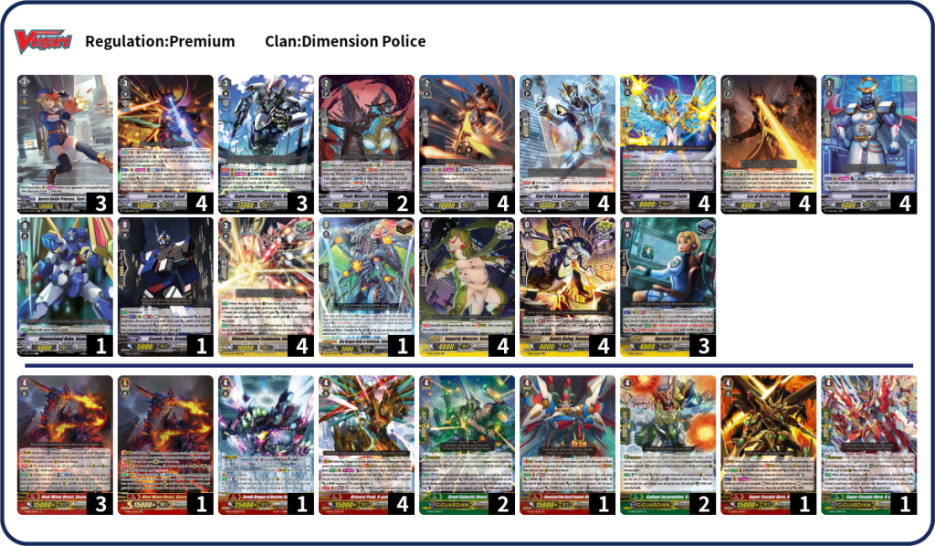 Premium: The Dimension Police main deck’s main goal was to easily be able to put “replaceable” rearguards on board to be able to rest them for Commander Laurel, which made Bravest Peak, X-Gallop extremely threatening as early as turn 3. In order to try to outgrind the opponent, we built the deck to be extremely tanky by using Dimensional Robo, Dailiner, Tazer Lage, Ginguard, and Enigman Calm, headed with Geomaglass in the G-Zone. Enigman Calm is honestly the star of the show though, being a repeatable perfect guard that you can recycle every turn you X-Gallop. Reika and Sludge are part of the advantage side of the deck, along with Zeal, which allows you to keep your resources up while trying to break through with Gallop.