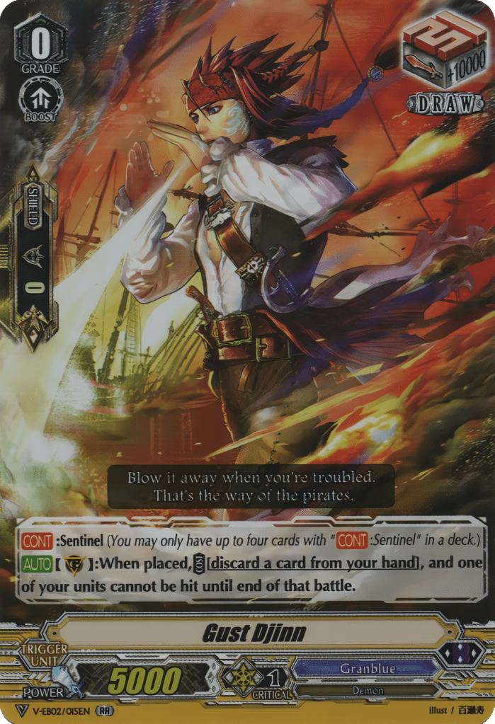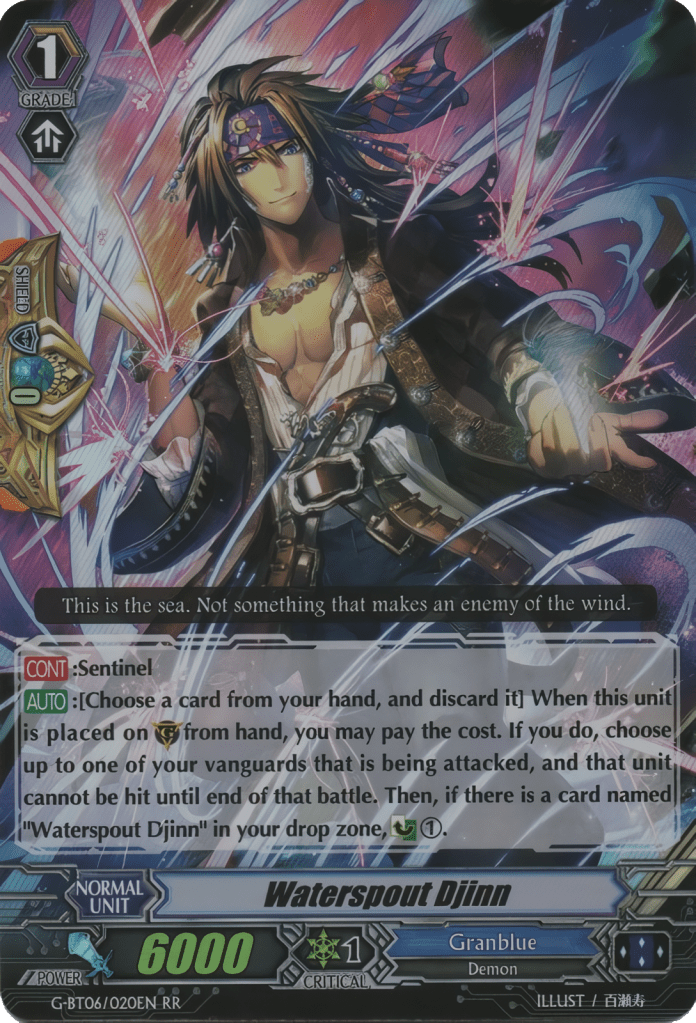 Starting with Sentinels, playing 1 Sanctitude and 3 Waterspout Djinns is recommended. Sanctitude gets around guard restrictions like Bartholomew, Chainrancor, Linka on a DP Vanguard, Mizukaze, etc. It’s also a 1 card PG when your opponent is on a stride in general.